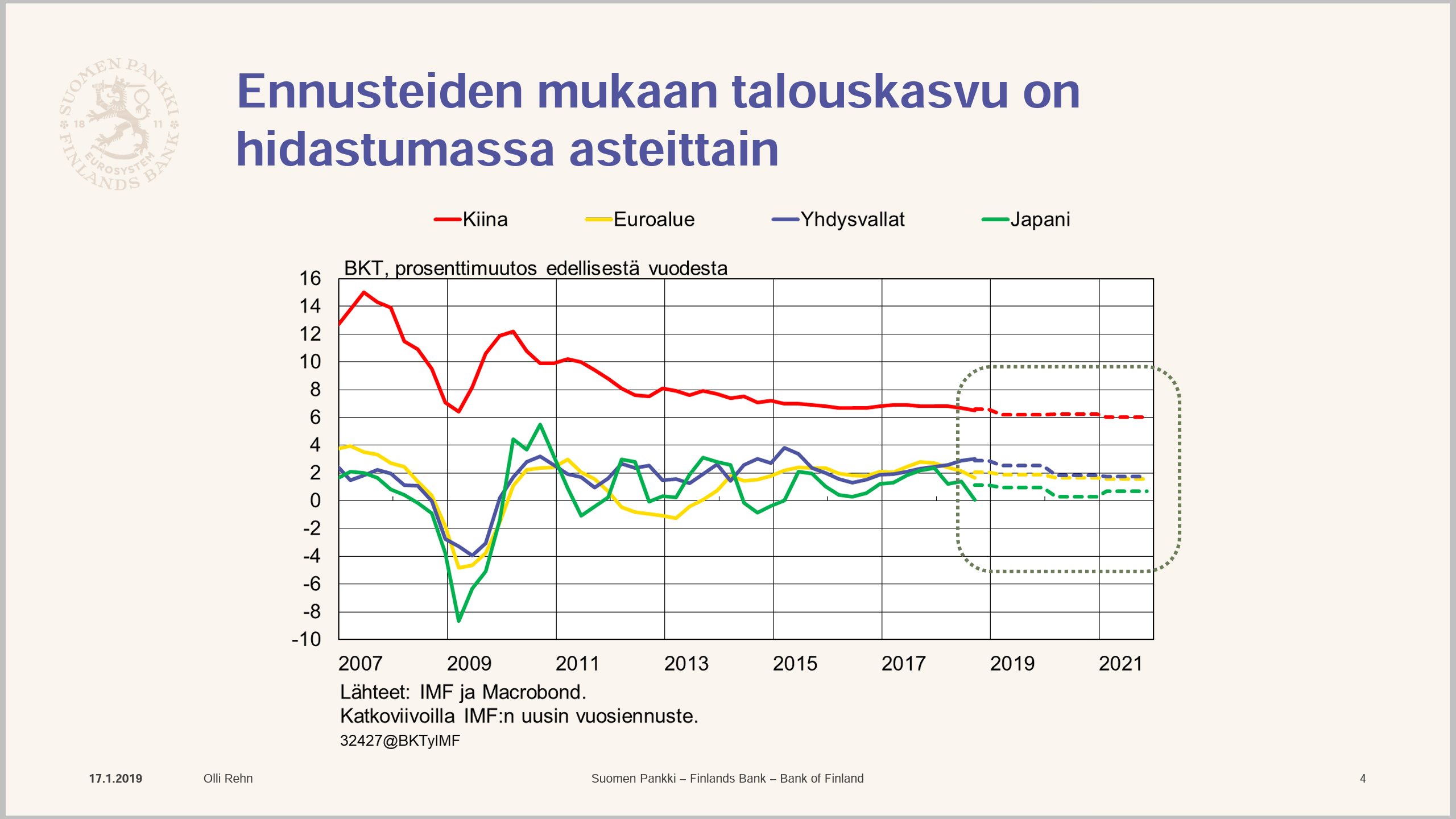 Kiinan hidastuva talouskasvu, suurvaltojen tullinokittelu ja brexit vaikuttavat erityisesti euroalueen vientiteollisuuteen ja talouteen Suomen Pankin mukaan. Nämä näkyvät todennäköisesti myös Suomen taloudessa.